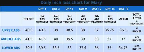 "I wish I would have taken before and after pictures, but instead I measured every 3 days so I could document my results. Even though I didn't get results from the first treatment, when it was all said and done, I lost 13.75 inches in 18 days. I am glad I listened to Suzanne's recommendation and used six treatments See daily chart below."